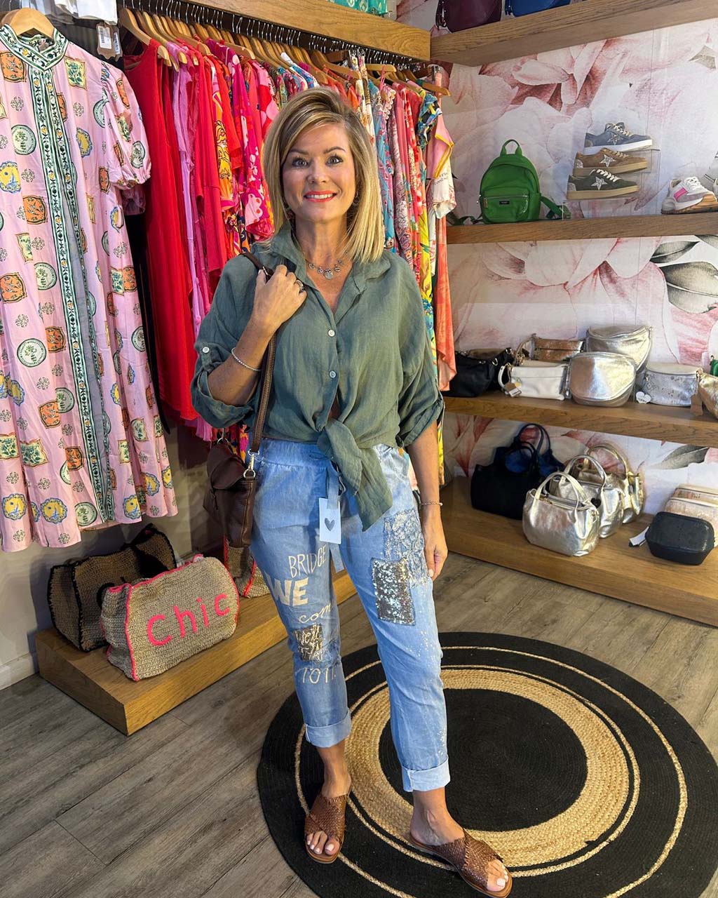 The shirt is a long-sleeve, button-down blouse designed with a relaxed, loose fit. It features a deep olive-green base color with vertical white stripes, creating a sleek and elongated look. The neckline has a classic collar with a slightly open V-shape, adding to its casual, breathable style. The shirt is fastened with light-colored buttons that subtly match the tones of the fabric. The sleeves are rolled up to three-quarter length, giving it a laid-back yet polished appearance. The hemline is slightly rounded with side slits, allowing for comfort and ease of movement. Made from a lightweight, airy fabric—likely cotton or linen blend—this shirt is ideal for warm weather and versatile enough for both casual and semi-formal wear.