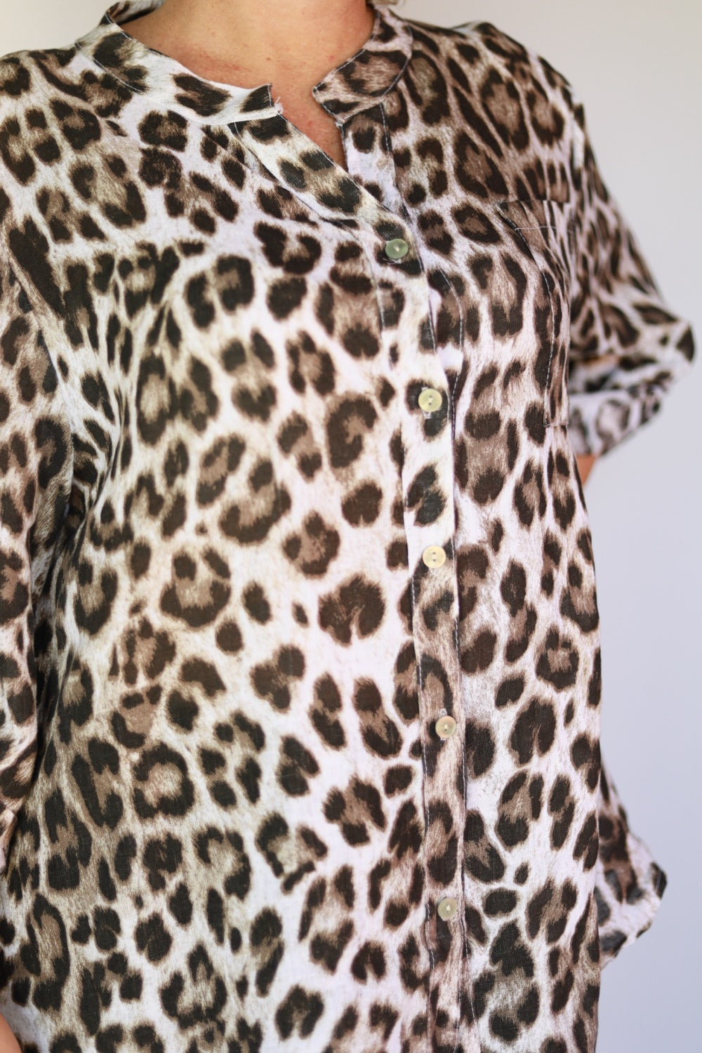 Elevate your everyday style with this timeless leopard print shirt. Featuring a mix of rich brown and black spots on a soft beige background, this piece brings a chic, safari-inspired vibe to your wardrobe. The relaxed fit ensures comfort, while the lightweight, breathable fabric makes it perfect for all-day wear. Designed with a neat collarless neckline, full button-down front, and roll-up sleeves secured with button tabs, it’s both stylish and versatile. Wear it loose over leggings for a laid-back look or tucked into jeans for a polished finish.