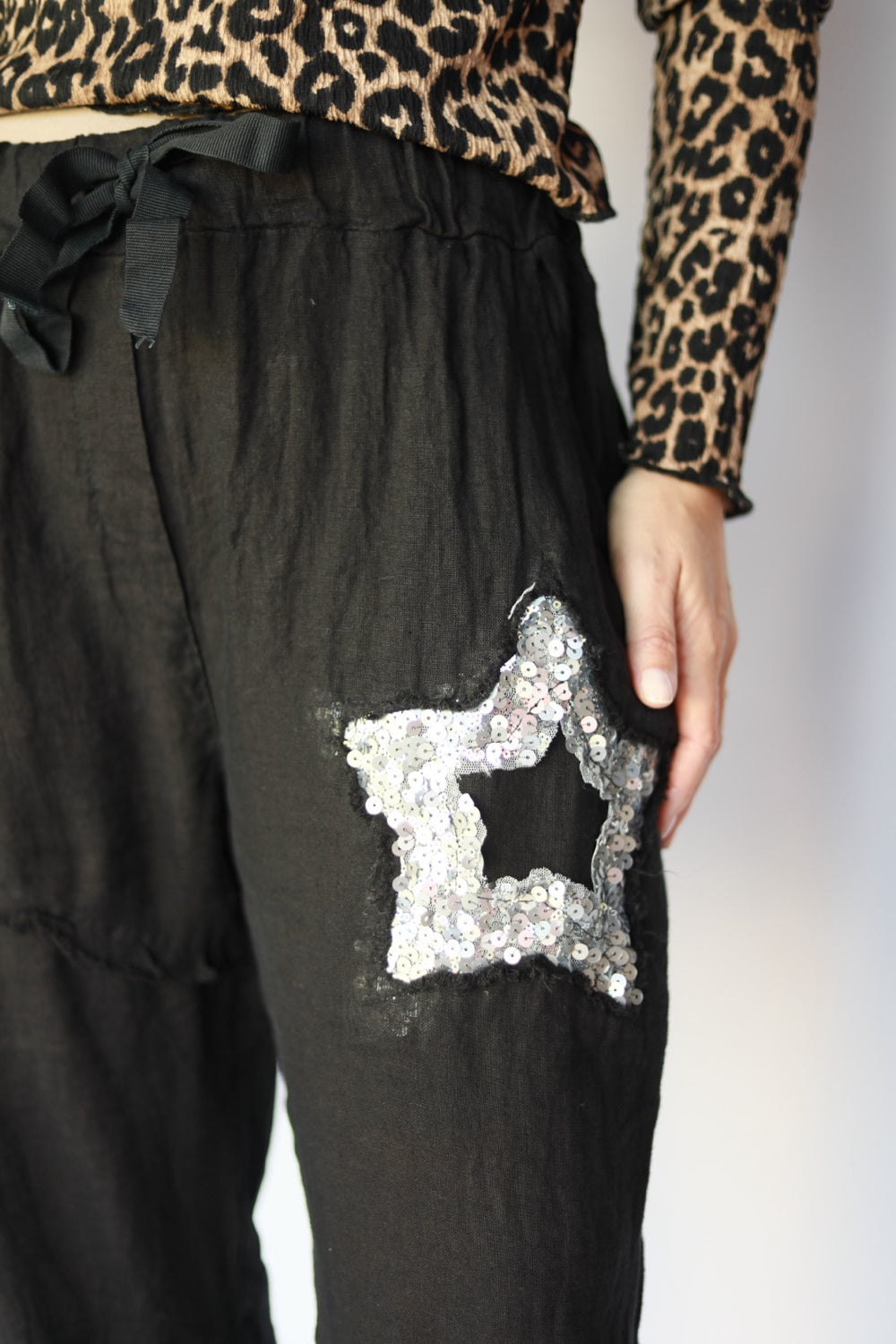 These relaxed-fit black pants are the perfect blend of casual comfort and statement style. Crafted from lightweight, breathable fabric, they feature an elasticated waistband with a matching fabric tie for an adjustable fit. The standout detail is the shimmering silver sequin star patch on the side, adding a playful touch to the laid-back look. Rolled cuffs complete the easygoing vibe, making them perfect for pairing with a simple tee or tank for effortless everyday wear.