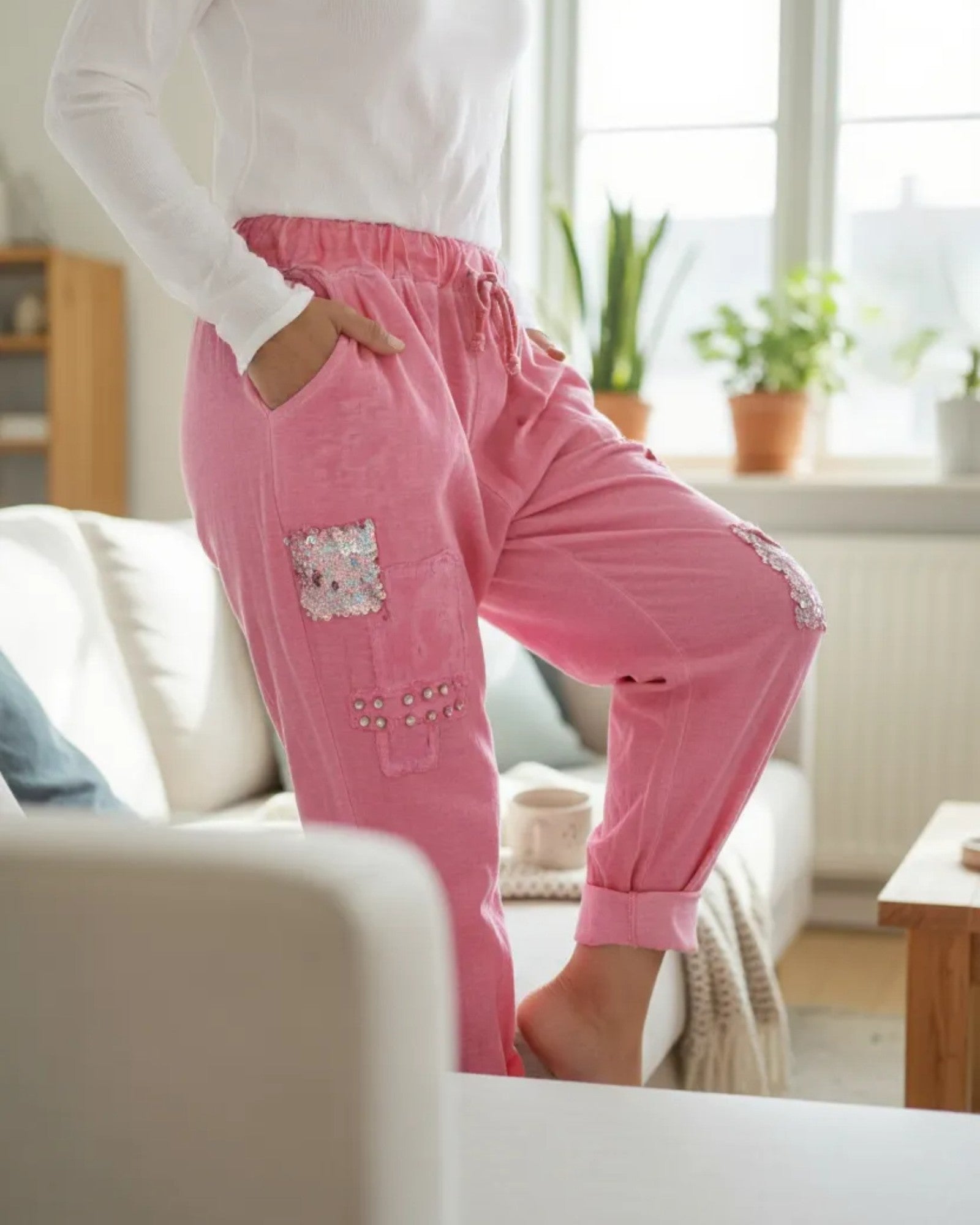 Brighten up your casual wardrobe with these fun and comfy pink jogger-style pants. Designed with an elasticated drawstring waistband for the perfect fit, these pants feature rolled cuffs for a relaxed vibe. Eye-catching patchwork details embellished with sequins and studs add a touch of sparkle and personality. Made from a soft, lightweight fabric, they’re ideal for all-day wear while making a bold fashion statement. Perfect to pair with a plain tee or a patterned top for a playful mix-and-match look.