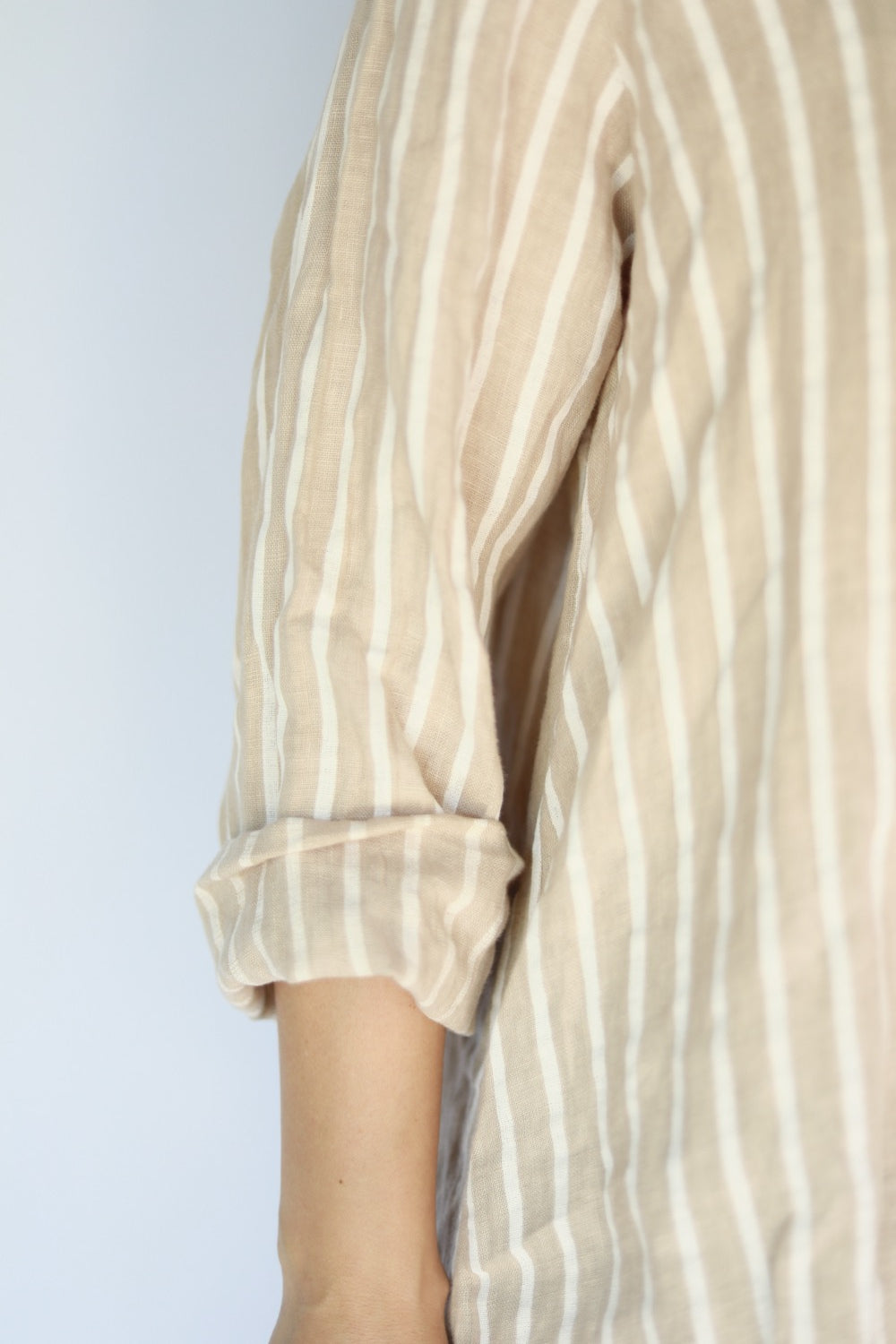 The shirt is a lightweight, long-sleeve button-down blouse featuring a beige base with vertical white stripes. It has a collared neckline with a relaxed, slightly open V-shape at the front. The buttons are small and light-colored, blending subtly with the shirt’s fabric. The sleeves are rolled up to three-quarter length, giving it a casual, effortless style. The fit is loose and comfortable, designed to drape naturally over the body. The hemline is straight with a slight curve at the sides, adding ease of movement. The material appears to be breathable, possibly cotton or linen, making it suitable for warm weather.