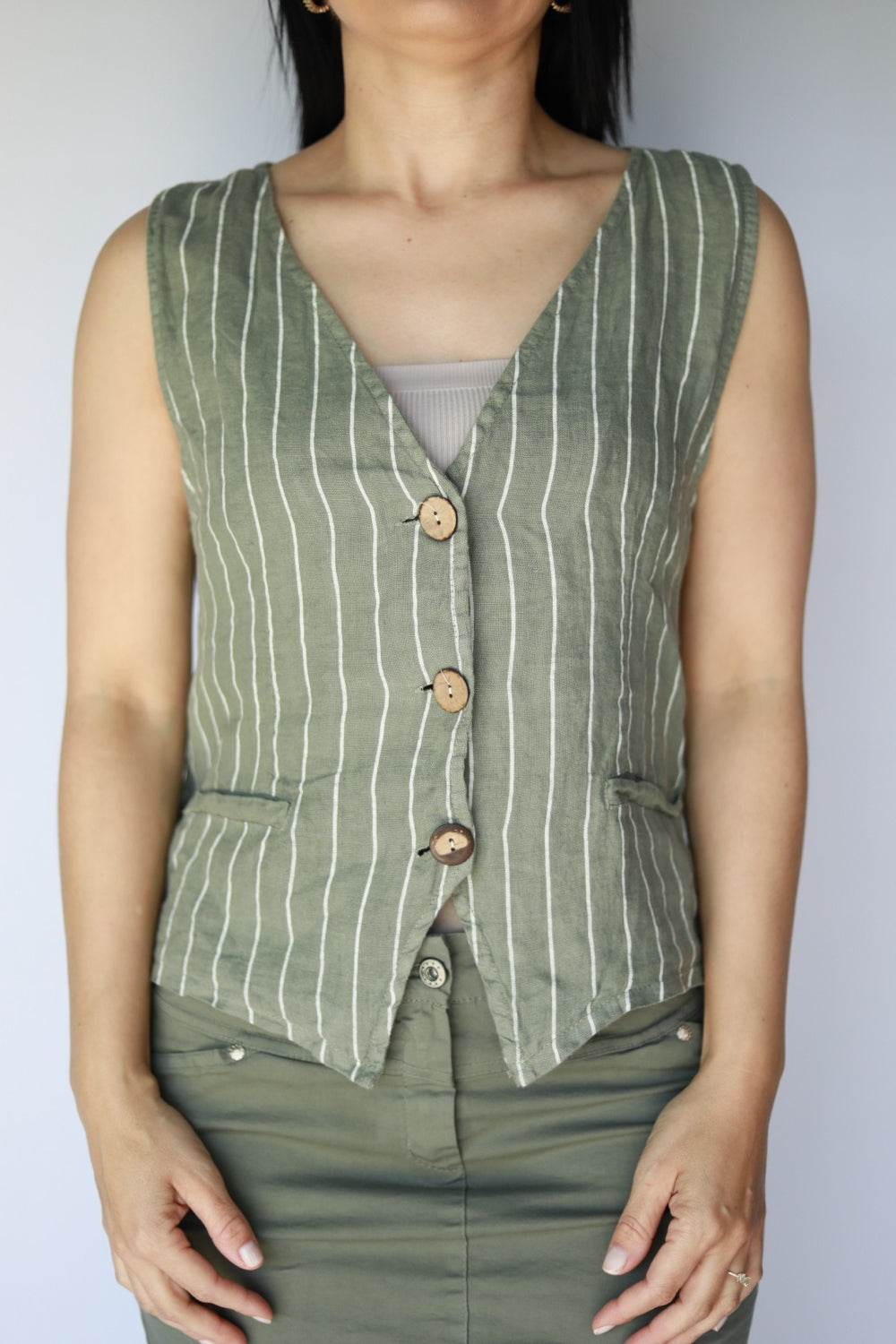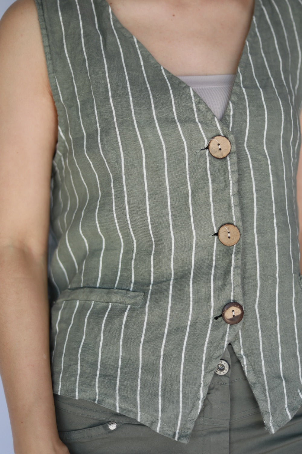 Sleeveless Linen Button-Up Vest – Olive Stripe