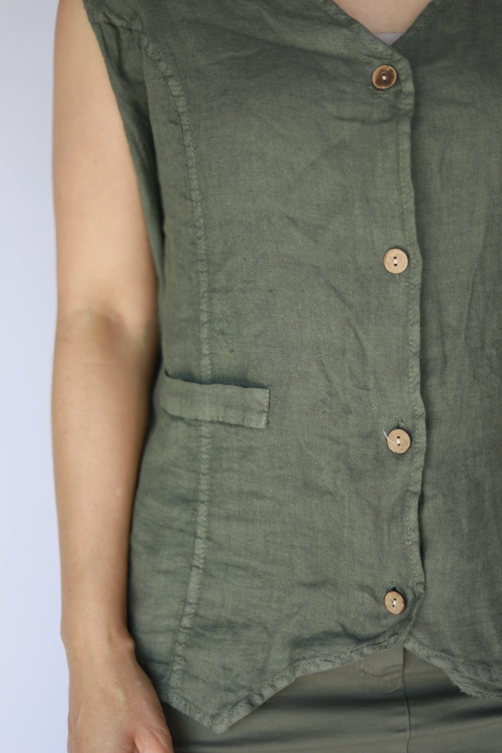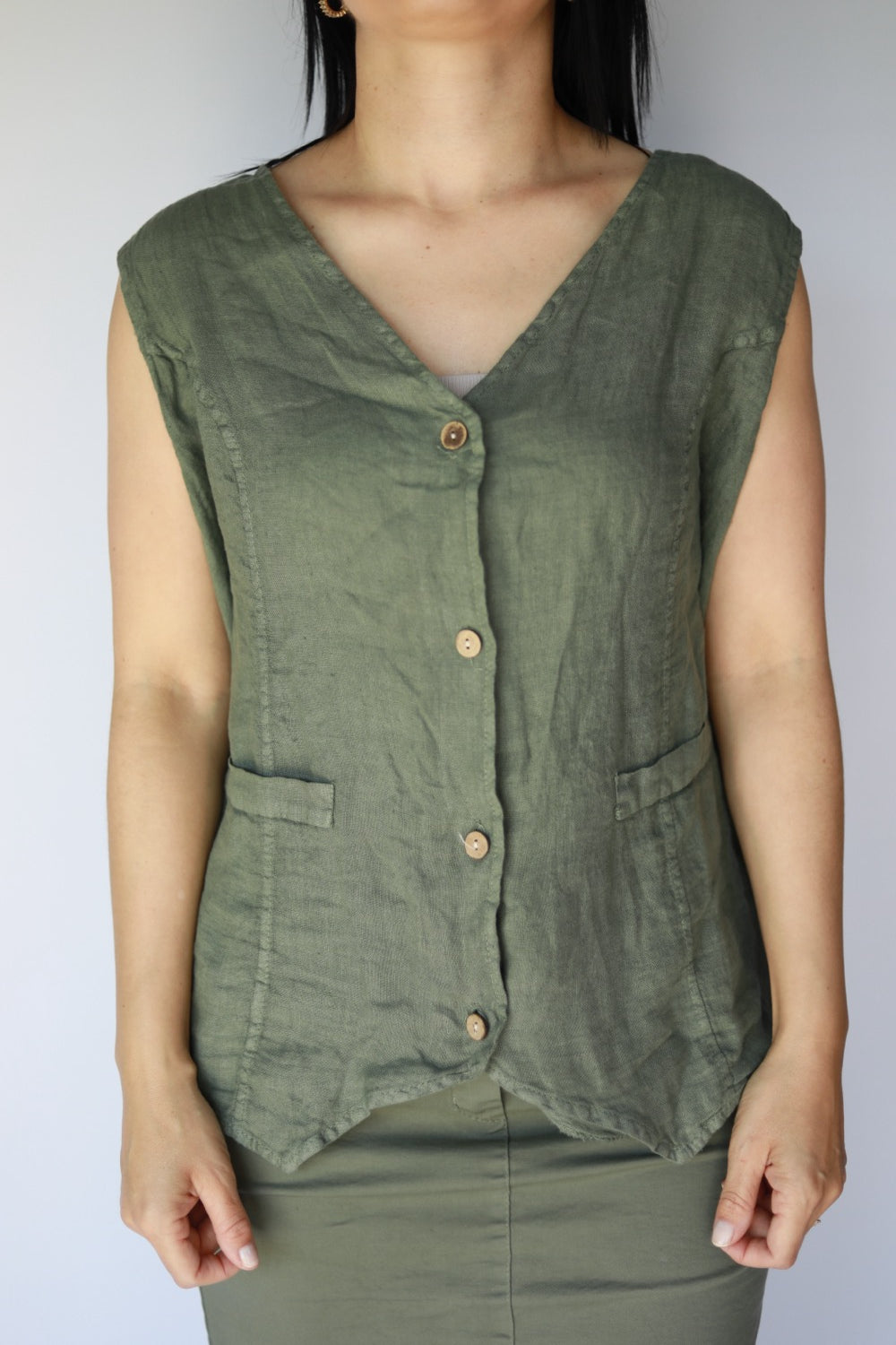 Effortlessly stylish and breathable, this sleeveless linen vest is perfect for layering or wearing on its own. Designed in a timeless olive green shade, it features a flattering V-neckline and natural wooden buttons down the front for a rustic-chic feel. The structured yet relaxed fit pairs beautifully with skirts, trousers, or denim for both casual and smart looks.