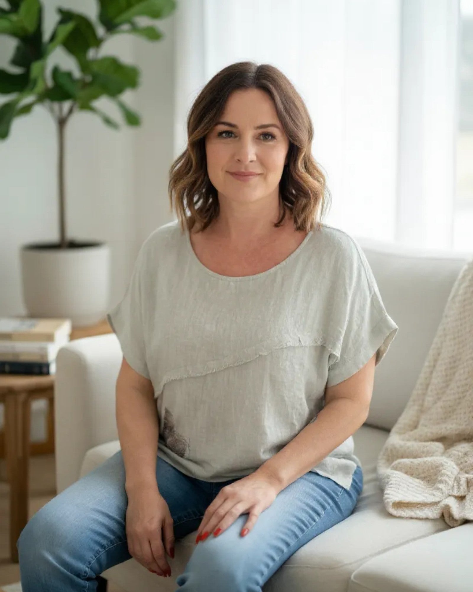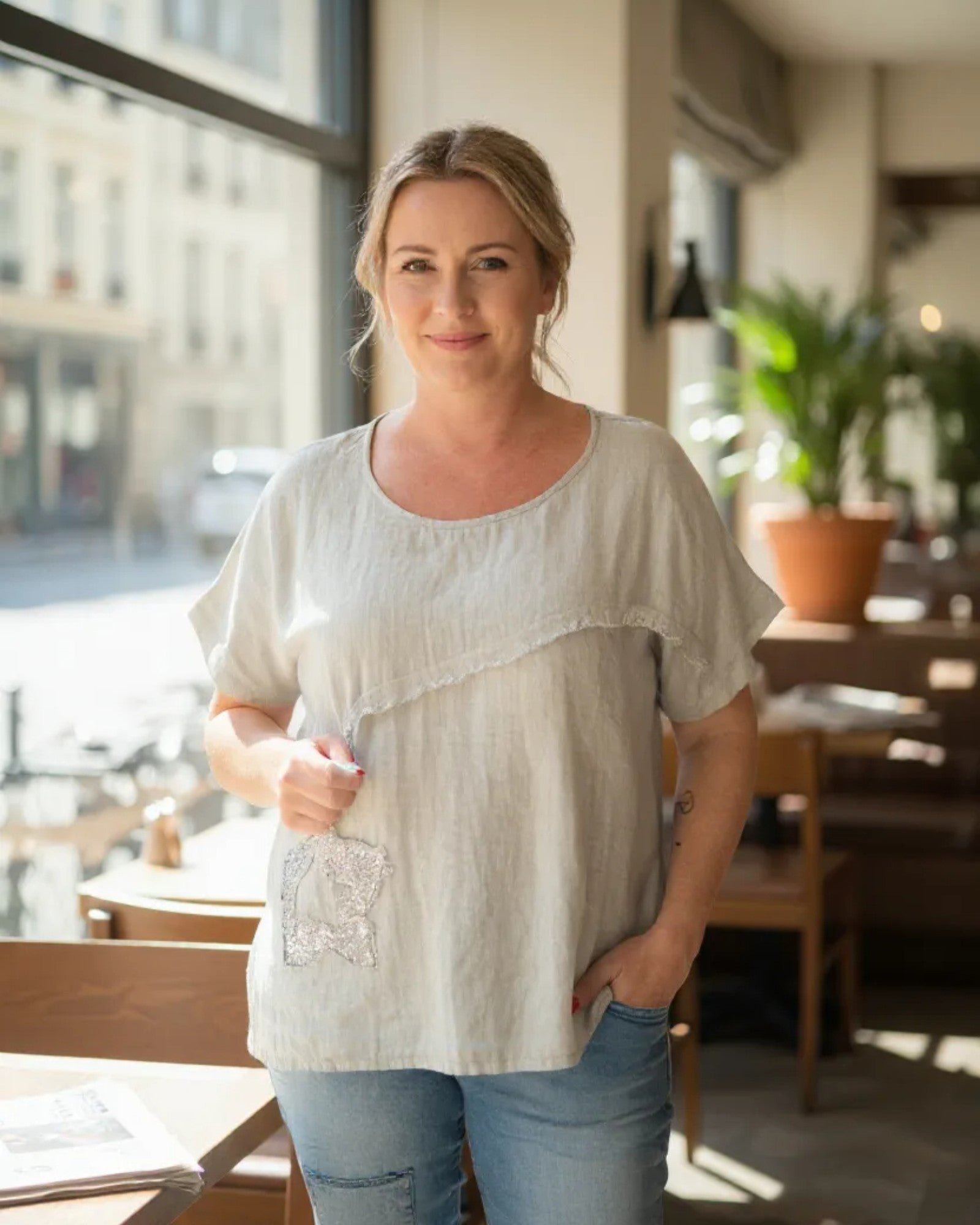 Light Sage Green Linen Top with Sequin Star Detail