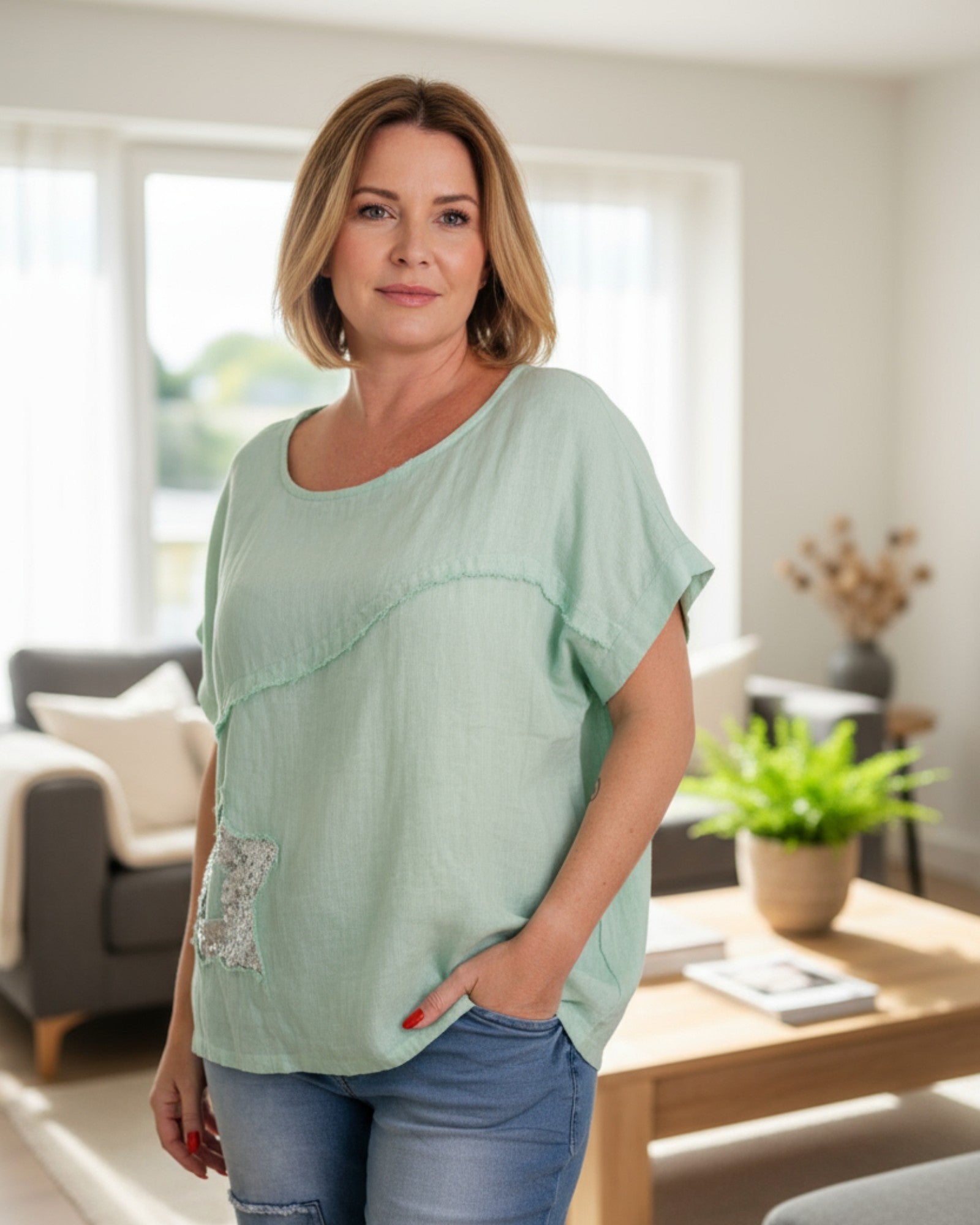 Eye‑catching silver sequin star patch on the lower front, adding a playful sparkle.
